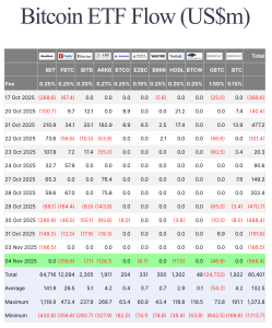 Spot Bitcoin ETFs saw a sharp $566.4 million outflow on Tuesday, Nov. 4, extending its five-day drain to roughly $1.9…