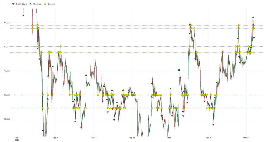 The clearest near-term resistance sits at $73,500 and $73,800. Those two levels form a top channel pair in the active zone and have produced repeated rejections in the recent stretch of the data.