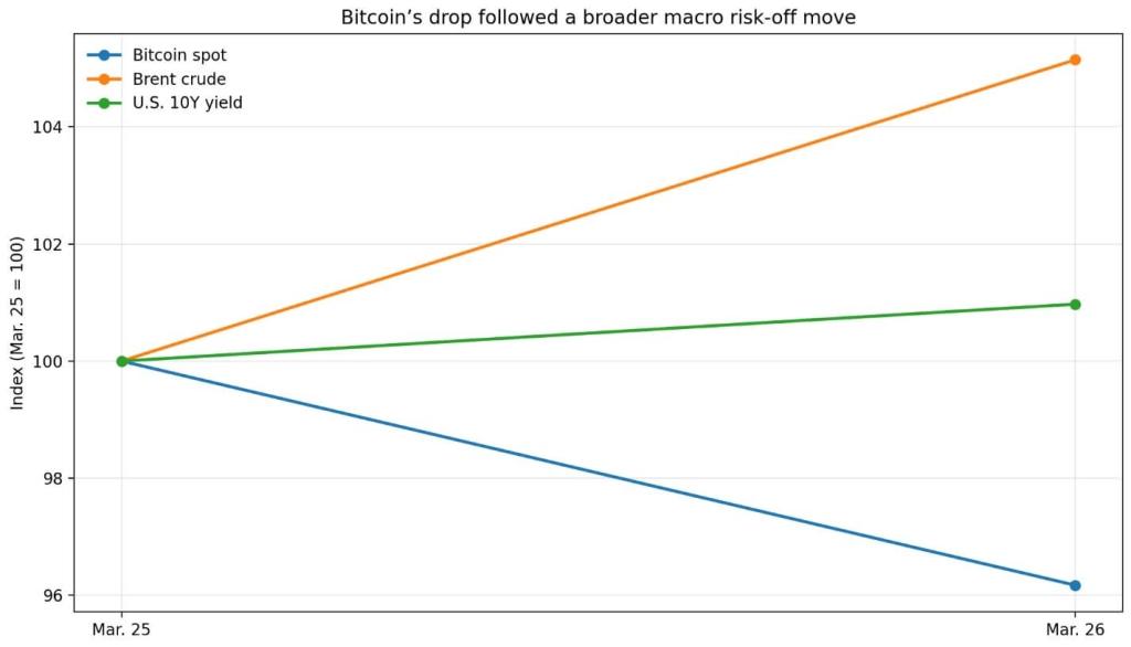 An indexed chart shows Bitcoin falling roughly 4% from Mar. 25 to Mar. 26 as Brent crude surged above 105 and the U.S. 10-year yield climbed.